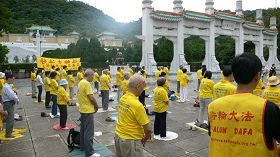 法轮功学员在101大楼外高喊「法轮大法好」、「停止迫害法轮功」的声音清楚宏亮,无论是现场民众或透过萤幕播送,都让人印象深刻。