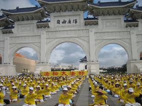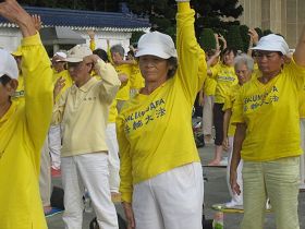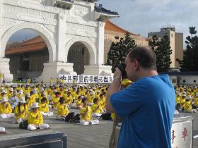吴先生取了各种角度,尽情的拍摄,在不知不觉中,他把所有的底片都拍完,当他知道法轮功学员九年来经历了中共各种非人道的迫害时,非常不解,他表示,将来一定尽其所能的把法轮功的真相透过镜头让更多的人知道。 对于大陆海协会会长陈云林和一群中共官员来台访问,法轮功学员以“真、善、忍”的精神,理性、平和的向世人展示法轮大法的美好,表达他们不变的诉求-“立即停止迫害法轮功”。这一切看在民众的眼里,获得民众广泛的支持。 从开始就一直在旁边看着法轮功学员炼功的庄先生说,站在这里他感受到一股平静祥和的力量,看这一群老老少少的修炼人,就知道中共的打压没有道理。站在一旁等朋友的一位老先生也表示,他的朋友也在里面炼功,他说,如果每个人都能学法轮功的“真、善、忍”,世界一定更祥和美好,社会可能也不需要警察了。 从纽约来的Ray和爷爷第一次造访台湾,他们盛赞台湾的人情味,看到法轮功非常好奇,Ray的爷爷当场比划起来,Ray很仔细的提了一些问题后,对他八十二岁的爷爷说:“这个功法对你有好处”,并把一些真相资料认真的收起来。 法轮功的真相从法轮功学员身上体现,特地从桃园莺歌来帮阿妈照相的陈先生表示,我的阿妈今年八十一岁,炼功后,以前的病痛一扫而空,身体变的非常的硬朗。一早就和学员从屏东搭乘巴士北上的陈阿妈精神奕奕的说,以前每周都要到医院报到,现在经常出国,到世界各地以亲身体验告诉别人“法轮大法好”。 到中正纪念堂参观展览的游女士和先生表示,看到法轮功学员静静的坐着,真的非常慈悲祥和,和一般的抗议非常的不一样,对于中共活摘法轮功学员的器官,他们觉的非常令人发指,并表示回去一定要好好了解法轮功。 一对澳洲来的年轻夫妇,从澳洲媒体知道中共活摘法轮功学员器官的讯息,一直想深入了解法轮功,没想到这次到台湾才真正的看到法轮功,拿着法轮功学员给的书签,他们马上找到澳洲炼功点的电话,并表示回去要立刻和炼功点联络。 在炼功中,载着大陆游客的一部游览车经过,看着游客们贴着玻璃睁大眼睛向外看,他们应该见识了台湾的自由。目前从事国际领队工作的法轮功学员苏太太表示,今天来这边就是要让中共官员看到台湾有多少法轮功学员,台湾这一片自由的土地上法轮功学员是合法的,在世界上很多地方法轮功也都蓬勃的发展,法轮功是好的是善良的,做好人炼功没有错。 刚从另一个抗议活动路过的黄姓退休老师则说:“每一个百姓都有集会的自由、言论的自由,有修炼的自由,在台湾都是自由的。我去过加拿大就看到法轮功做了那么多,几年都坐在那个中使馆的旁边,我每次走过,开车过去都给他们加油。他们真的精神可嘉。”