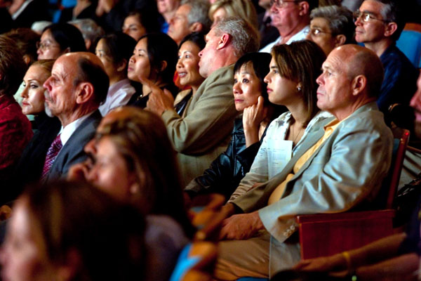 【明慧网二零零八年十二月二十一日】(明慧记者沈容劳德代尔堡报导)二零零八年十二月十九日,神韵巡回艺术团在美国佛罗里达州-劳德代尔堡的首场晚会圆满落幕。迈阿密大学会计学教授麦克-瓦纳(Mike Werner)表示:「我原本以为只是一般的舞蹈表演和音乐演奏,没想到竟然具有这么丰富的精神内涵。我认为观赏这样的演出非常好,每个人在精神上都可以更加理智清醒。」  神韵巡回艺术团于十二月十九日,在美国佛罗里达州-劳德代尔堡首场晚会的观众。 |
