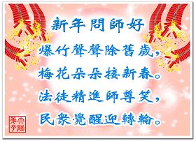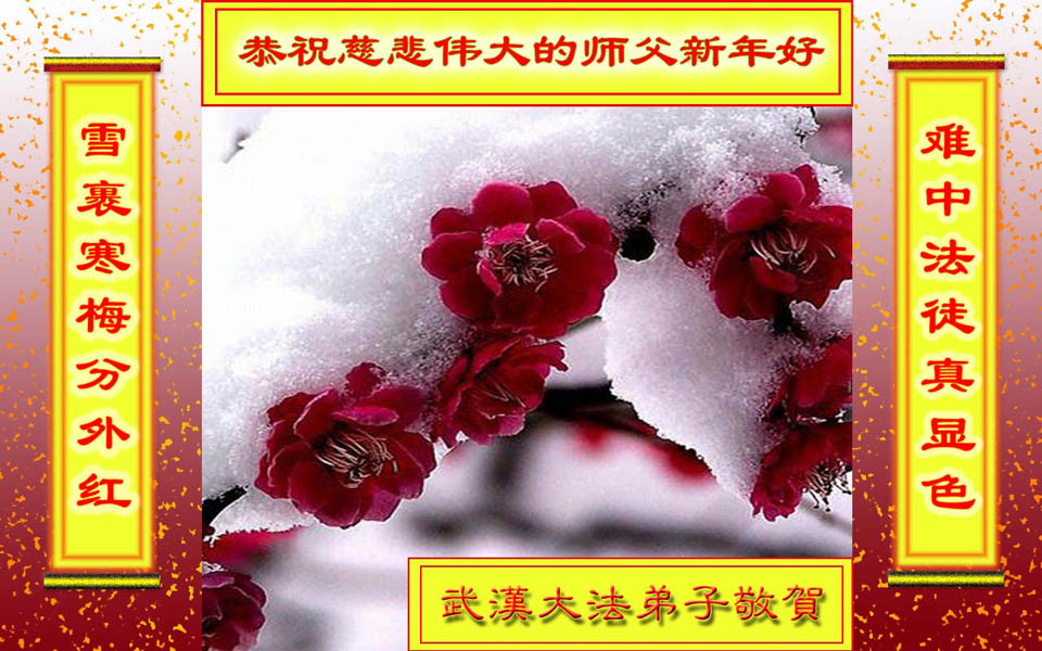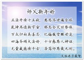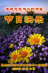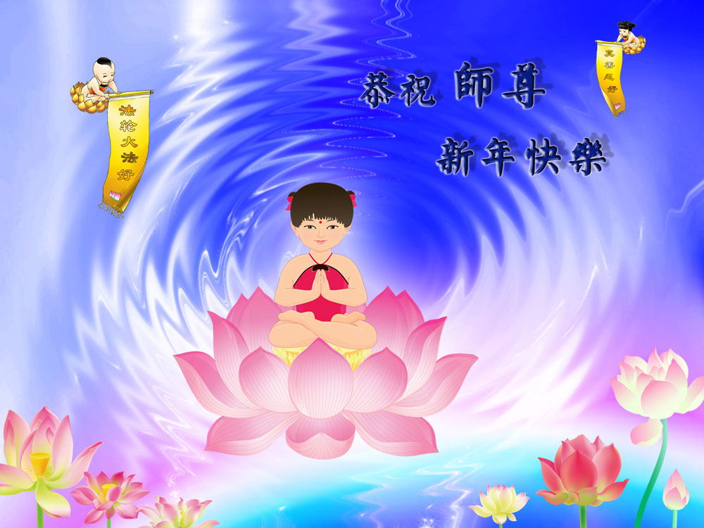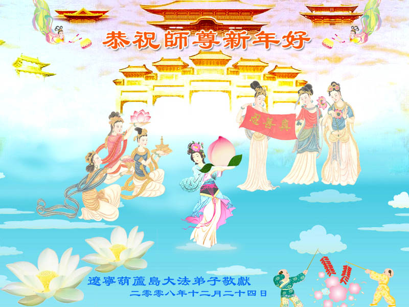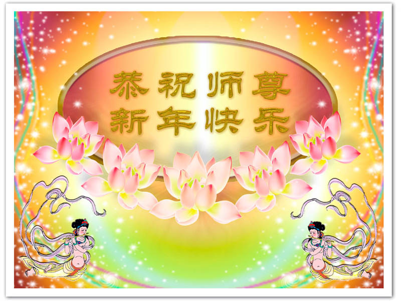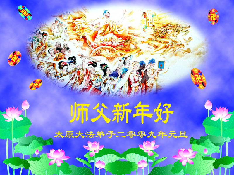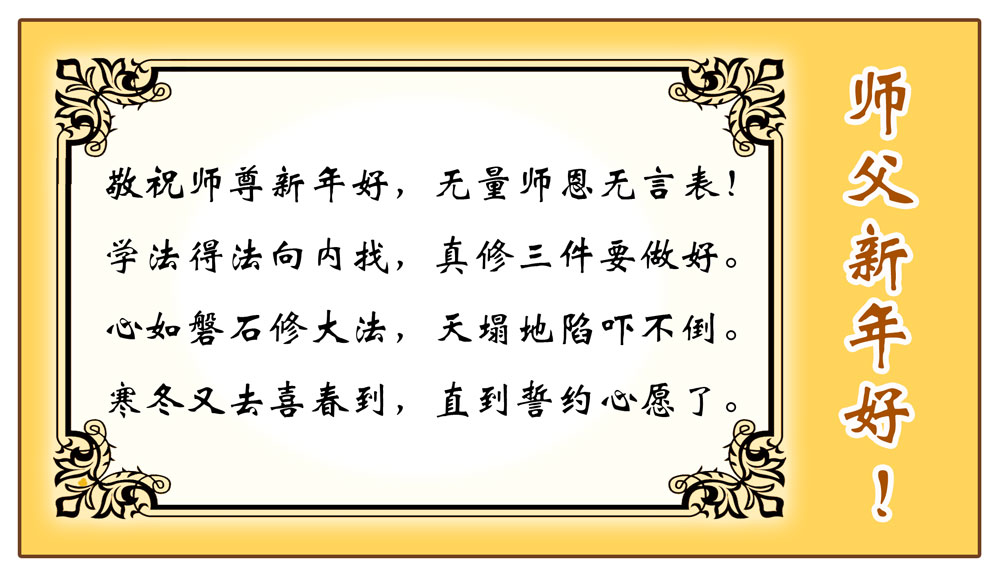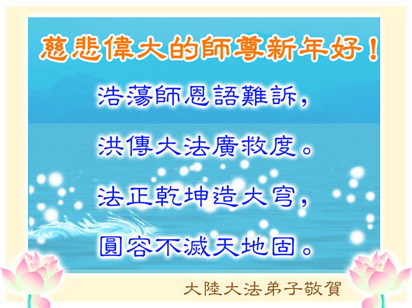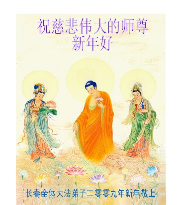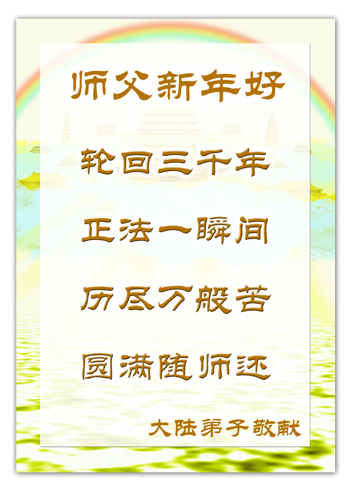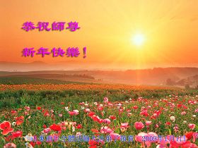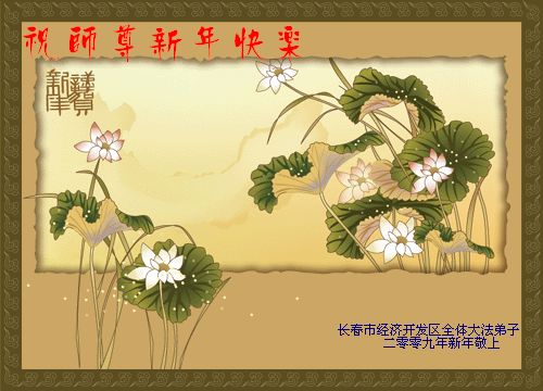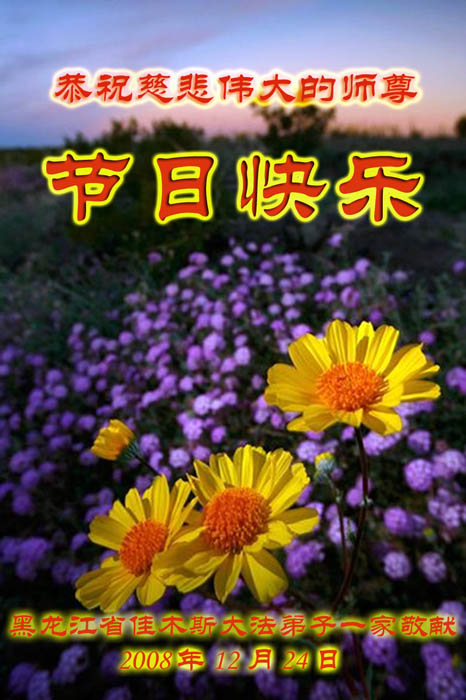 【明慧网二零零八年十二月三十一日】长春全体大法弟子祝慈悲伟大的师尊新年好!山东曲阜全体法轮大法弟子恭祝师尊新年快乐!枣庄大法弟子恭祝慈悲伟大的师尊新年好!新年到来之际,我们全家恭祝慈悲伟大的师尊新年好!致以最崇高的敬意。在有限的时间里我们要更加精進、正念正行、做好三件事。 枣庄大法弟子 二零零八年十二月二十四日 武汉大法弟子恭贺师父新年好!黑龙江省海林市全体大法弟子恭祝师尊新年好!新的一年来临,预示着我们会做的更好,救的人更多,绝不辜负师尊对弟子们的期望。弟子们想念师尊,向师尊合十。 黑龙江省佳木斯市大法弟子一家恭祝慈悲伟大的师尊节日快乐!感谢师父的慈悲苦度,我们坚信师父,坚信大法!以法为师,圆容整体,共同提高,理智清醒的做好师父要求的三件事,正念正行,不负师父的苦度,不负众生的期盼,喜迎和师尊团聚的春天的到来,普天同庆、同祝、同颂! 黑龙江省佳木斯市大法弟子一家敬献 2008年12月24日 长春市经济开发区全体大法弟子祝师尊新年快乐!太原大法弟子恭祝师父新年好!山西省太原市、古交市全体大法弟子向师父问好!祝师父新年快乐!弟子们虽然还有很多常人心和执著,但我们一定要坚定的走好师父安排的路,请师父放心。 二零零八年十二月二十四日 大连全体大法弟子恭贺师尊新年快乐!我们走过的每一步都是师尊的慈悲呵护和引领,千言万语无法表达师尊的浩荡佛恩,此刻只有感恩的热泪向师尊敬香叩首,跪拜合十:我们一定谨记师尊的教诲,修心归正,做好三件事,慈悲救人,兑现史前洪愿! 二零零八年十二月二十四日敬上 辽宁葫芦岛大法弟子恭祝师尊新年好!沈阳家庭资料点的大法弟子恭祝师尊元旦快乐!师恩浩荡语难诉, 千世幸遇师普度。 神韵天音洒金辉, 众生觉醒佛光沐。 九评斩妖兽印除, 世人醒悟赐洪福。 小花芬芳回归路, 乾坤正苍宇永固。 二零零八年十二月二十四日 大陆弟子恭祝师父新年好!