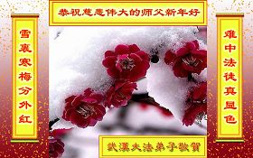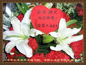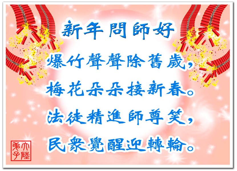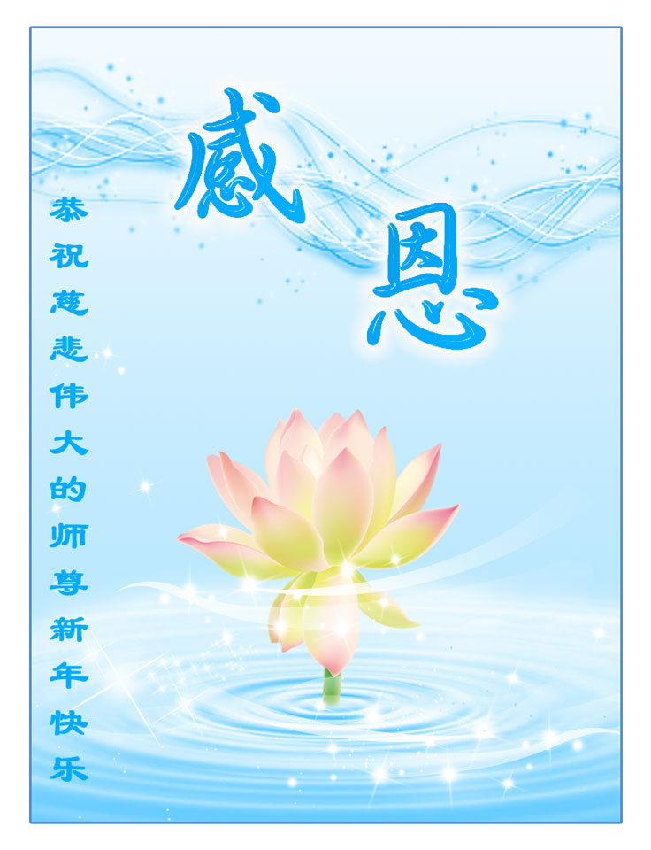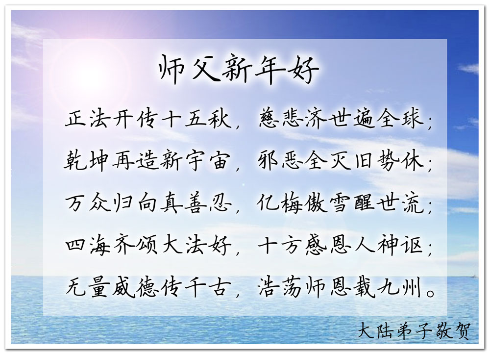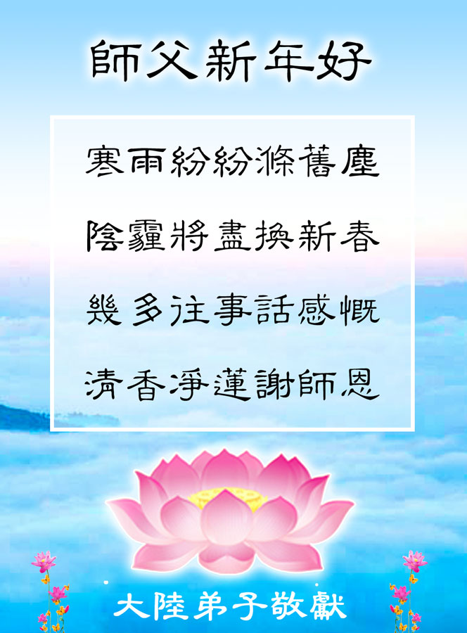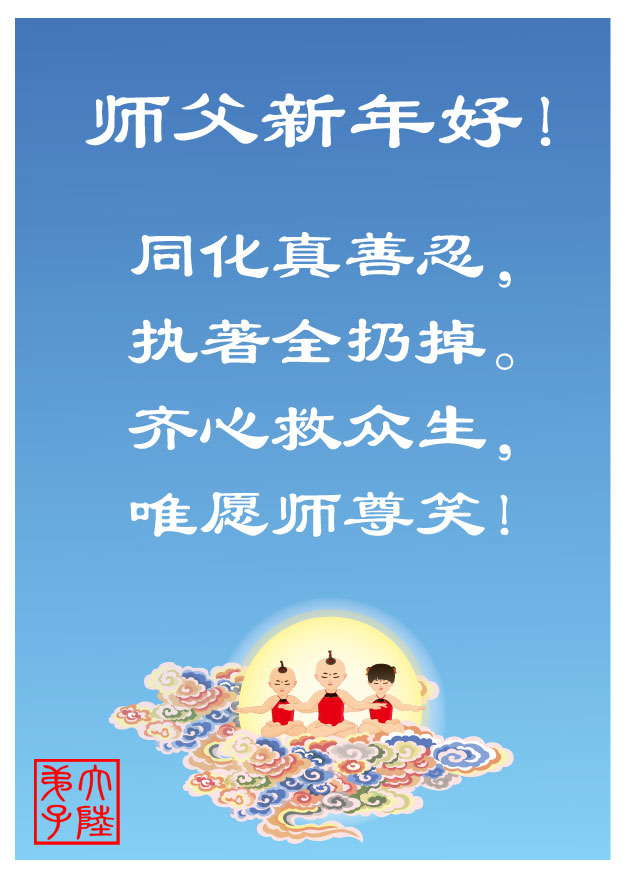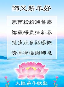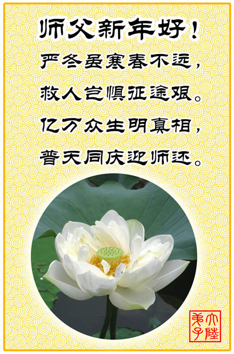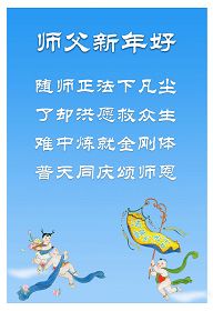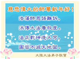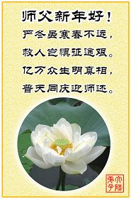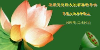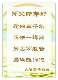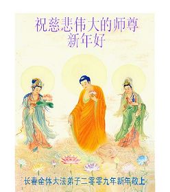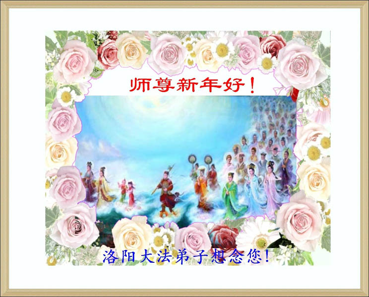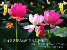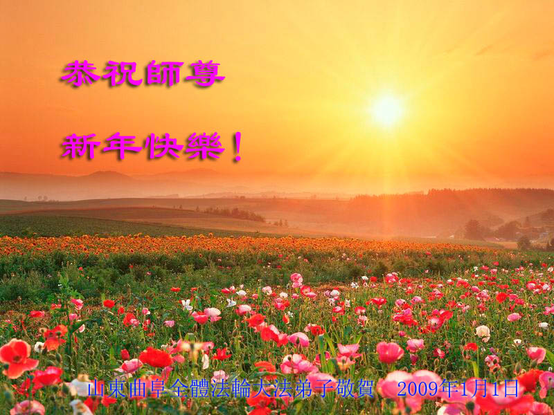 湖北省嘉鱼县牌洲湾全体大法弟子恭祝师尊元旦快乐!时间飞快,在新的一年里,牌洲湾全体大法弟子首先感谢师尊对弟子的慈悲呵护。弟子一定抓紧时间做好三件事,完成自己的使命,兑现史前的誓约,让师尊放心。 洛阳大法弟子恭祝师尊新年好!黑龙江省汤原县大法弟子恭祝师尊元旦快乐!弟子想念您!舒兰市大法弟子给师父拜年!尊敬的师父:新年好! 苍穹奏乐,宇宙同歌,唱不完主佛佛恩浩荡; 蓝天做纸,海水做墨,写不完师尊救度之恩。 我们一定遵照师尊教诲,对师父要求的三件事“做的更好,效率更高,救人更多。”(《美国首都讲法》)完成我们史前的洪愿,兑现我们的誓约,圆满随师还。 合十 舒兰市大法弟子 二零零八年十二月二十四日 吉林省公主岭市大法弟子恭贺师尊新年快乐!临沂全体大法弟子在这法正人间光辉时刻即将到来之际,在救度众生的紧急脚步一刻不怠之时,新的一年又来到了。至此佳节之际我们临沂三区九县的全体大法弟子,遥祝远在大洋彼岸慈悲伟大的师尊节日快乐。并向师尊保证:一定要在更加努力做好师尊安排的三件事的同时,勇猛精進,圆满修好自己,完成史前大愿。 临沂全体大法弟子 2008年12月25日 湖北省嘉鱼县全体大法弟子恭祝慈悲伟大的师尊元旦快乐!兴城市全体大法弟子恭祝师尊新年好!清苑县全体大法弟子祝师父新年快乐!淄博全体大法弟子恭祝师尊新年快乐!行唐县全体大法弟子恭祝慈悲伟大的师尊新年快乐!行唐县全体新老大法弟子怀着无比激动的心情恭祝慈悲伟大的师尊新年快乐!请师尊放心,我们会努力做好三件事,跟上正法進程,决不辜负师尊的慈悲苦度。 行唐县全体大法弟子叩拜! 2008年12月25日星期四 佳木斯一家庭学法小组向伟大的恩师祝新年好!我们很荣幸得法,能在师父传的大法中修炼,也是我们的千古机缘,我们一定努力实修,按照师父要求去做,不辜负师父的期望,完成人间修炼正法大事。 佳木斯一家庭学法小组敬上 二零零八年十二月二十五日 山东省淄博市临淄区大法弟子恭祝慈悲伟大的师尊新年好!慈悲伟大的师尊,弟子给您拜年!师尊新年好!您辛苦了!弟子想念您! 山东省淄博市临淄区大法弟子 二零零八年十二月二十五日 河北省辛集市大法弟子恭祝师尊新年快乐!在新的一年里,我们一定再勇猛精進,做好三件事,更多的救度众生,助师世间行。让师尊多一份欣慰,少一些操劳。 辛集市大法弟子 2008年12月25日 大庆让胡路区一学法小组大法弟子恭祝师尊元旦快乐!师尊好!湖南长沙大法弟子向师父致以最崇高、最虔诚的问候和祝福!弟子眺望着天际,总希望能亲眼瞧一瞧日夜思念的师尊,那将是多么的幸福。其实,师尊时时在弟子的心中,在弟子的身边呵护弟子。无数次在梦中喊着师父,每每想起师尊就热泪盈眶。那种思念,那种幸福,那种感恩,那种自豪,就象是来自宇宙大穹那种深不可测的莫大的缘……慈悲,伟大的师尊,在这正法的最后时刻,弟子一定勇猛精進,完成好师尊交待的三件事。祝师尊新年快乐! 长沙大法弟子 二零零八年十二月二十一日 河北省博野县某村全体大法弟子祝慈悲伟大师尊元旦节快乐!弟子们想念师父!我们村几个大法弟子家盛开了婆罗花。婆罗花开,圣者归来。弟子们一定不辜负师父的期望,做好三件事,早日迎接师父的归来。全村大法弟子跪拜师父的救度之恩! 北京市房山区农村的大法弟子向慈悲伟大的师父拜年!在过去的几年里边远农村大法弟子人数比较少,迫害的程度也比较严重,但是我们一直在做着自己该做的事,在新的一年里请师父放心。我们农村的大法弟子会加更精進做好三件事,救度有缘人。 甘肃镇原县全体大法弟子恭祝慈悲伟大的师尊新年快乐!大兴安岭塔河县大法弟子祝师尊新年快乐!我们一定勇猛精進,以法为师,做好三件事,救度更多的众生。 大兴安岭塔河县大法弟子 锦州大法弟子恭祝慈悲伟大的师尊元旦快乐!弟子在锦州跪拜师尊元旦快乐!弟子感激师尊的时时慈悲呵护,弟子入道得法十年有余一路走来,从什么都不知道到成为真正的正法时期的大法徒,其中不知师尊得付出多少艰辛。弟子一定要在正法最后的时光里做好自己应该做的三件事,更加用心学好法,信师信法。最后再一次恭祝慈悲伟大的师尊元旦快乐!最后代表上不了网的大法弟子恭祝慈悲伟大的师尊元旦快乐! 锦州大法弟子敬上 二零零八年十二月二十五日 我们全家大法弟子恭祝伟大的师尊新年好!感恩师尊的慈悲苦度,做好三件事,完成史前大愿。 德州市学法小组祝师尊新年快乐!感谢师尊的慈悲苦度,我们一定听师父的话修好自己,做好三件事。 合十 德州大法弟子 离家在外的两名大法弟子向伟大的师尊拜年,祝师尊新年好!弟子一定不辜负师父的救度之恩,做好三件事,遇到矛盾向内找,走正师父安排的路,随师父回家。 广东省惠州市全体大法弟子恭祝慈悲伟大的师父新年快乐!安徽滁州全体大法弟子恭祝师尊元旦快乐!一大法弟子恭祝慈悲伟大的师尊元旦快乐!慈悲伟大的师尊: 2009年元旦好!您辛苦了! 您为我们受尽折磨, 您为我们洗净污垢, 您为我们铺平道路, 您让我们从新铸就。 师尊啊! 我们无以为报, 我们还经常不知天高地厚! 经常懈怠。 经常犯错。 经常糊涂。 您伟大的慈悲, 永远的慈悲, 让弟子我羞愧难言。 何时才能让您少操一份心? 何时才能做一个真正的大法粒子? 我向您保证: 从现在开始