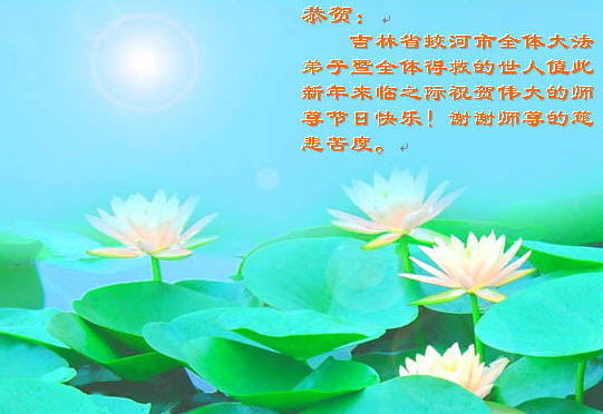 【明慧网二零零八年十二月三十一日】中国黑龙江桦川县一名普通世人恭祝李老师元旦快乐!我是中国黑龙江桦川县一名普通世人,在我及家人认清中共邪党的邪恶本质和法轮大法的美好之后,我的家庭从此和睦了,以前的疾病不见了。今年,我将大法的真相告诉在病床上准备截肢的哥哥,并叮嘱他默念“法轮大法好,真善忍好”。奇迹发生了,医生说他的脚不用截肢了。我们全家激动不已,无法用语言表达对李老师的感激之情。我们只能遥祝身在海外的李老师元旦快乐。盼望中共邪党早一天灭亡,法轮大法早日平反,那时,我们千千万万的受益者就能亲眼见到您了。 湖北大法弟子的七十余名亲属恭祝师尊新年愉快!伟大慈悲的师尊:在二零零九年元旦、新年即将到来的时刻,我们这些大法弟子的亲属们,向师尊致以亲切的问候和崇高的敬意!祝师尊愉快!祝二零零九年在解体中共恶党的進程中师尊给众生带来更多的洪福!! 一个湖北大法弟子的海内外七十余名亲属叩拜 二零零八年十二月十七日 江苏省一对明白法轮大法真相的老年夫妻喜得大法敬祝恩师新年快乐!在这新的一年到来之际,我们夫妻老俩口向恩师叩拜:拜恩师!谢恩师!敬祝恩师新年快乐! 我们才得到大法二十几天,就已经体悟到大法的神奇和玄妙!今后我们一定要认真学法、炼功,在法理上多与老同修切磋,尽快提高上来。 江苏省一对年逾花甲老夫妻 二零零八年十二月二十五日 佳木斯市北部居民向师父问好!我们全家五口人向慈悲伟大的师父问好!祝师父新年快乐! 佳木斯市北部居民 2008年12月20日 大陆四口之家恭祝慈悲伟大的师父元旦快乐!在辞旧迎新之际,我代表一家四口及亲属同修恭祝慈悲伟大的师父元旦快乐! 师父,谢谢您!请您多多保重! 吉林蛟河市全体大法弟子暨得救世人祝伟大的师尊节日快乐!黑龙江省佳木斯市大法弟子全体家属及亲朋好友恭祝慈悲伟大的师尊节日愉快!感谢大法师父的慈悲苦度,感谢大法弟子们所做的一切,我们坚信师父,坚信大法!珍惜大法弟子为我们所做的一切,尽我们所能的讲清真相,广传《九评》,早日解体中共,结束人类苦难,期盼正法结束那一天早日的到来! 黑龙江省佳木斯市大法弟子全体家属及亲朋好友敬上 2008年12月24日 山东招远觉醒的世人及大法弟子家人恭祝慈悲伟大的师父新年好!
