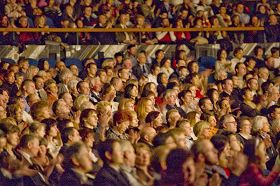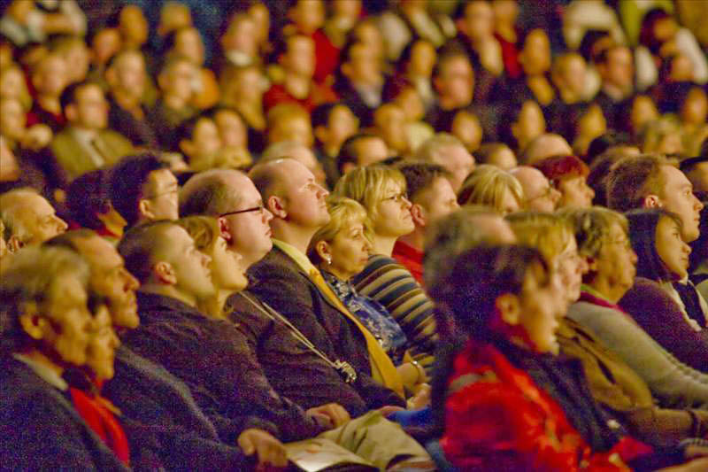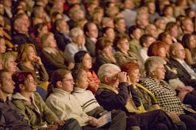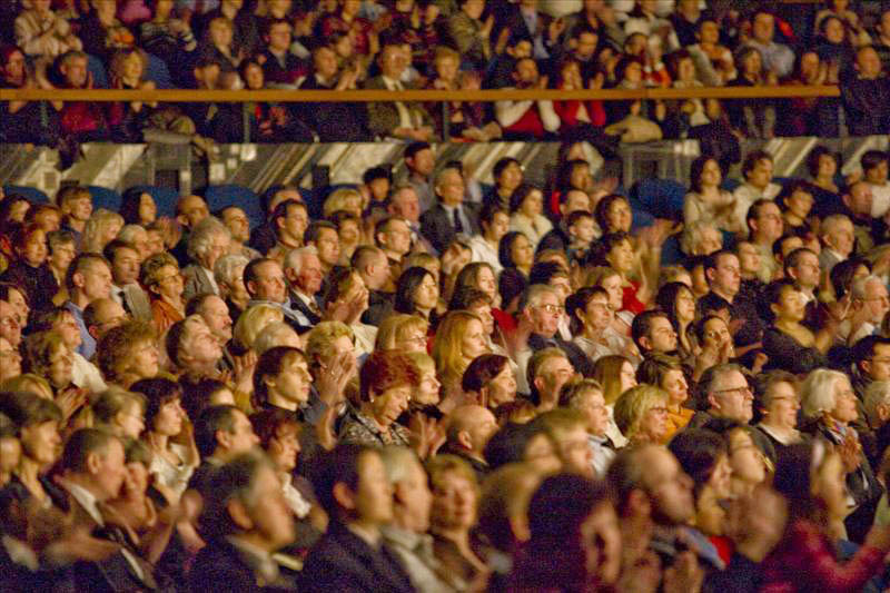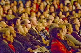 | 【明慧网二零零八年二月十七日】(明慧记者吴思静德国报道)随着神韵巡回艺术团在欧洲登陆,不常见的宜人气候悄然降临德国。继第一站杜伊斯堡市(Duisburg)之后,二零零八年二月十六日,神韵巡回艺术团降临拥有欧洲“曼哈顿”之称的法兰克福市的世纪剧院(Jahrhunderthalle),当晚的首场演出满场,现场观众气氛热烈。演出结束后,走出世纪剧院的人们的心情也变的和天气一样舒服、祥和。 * 媒体烘托 神韵作为热门演出登场 两个多月以来,神韵晚会广告上舞蹈演员如凤凰展翅般的造型在法兰克福城中四处可见。演出开始之前的几天,德国RTL电视台和SAT1电视台还在黄金时间播出了对晚会的介绍。跻身于德国几家最大日报之列的法兰克福汇报(FAZ)和法兰克福眺望报(Frankfurter Rundschau)等平面媒体也分别刊登了对晚会和演员的报导。一时间,神韵晚会演出活动成为德国金融中心法兰克福市的热门话题。 晚会开始前,主办方负责人莱克纳戈尔(Recknagel)向记者透露,法兰克福首场演出的售票情况相当不错。直到演出就要开始的时候还有人陆陆续续来买票。 *大型乐队飞抵德国 现场伴奏 前一日刚刚从美国飞抵法兰克福的神韵艺术团乐队为演出进行了现场伴奏,德国《欧华导报》的总编钱跃君博士感慨的说:“近十年来从未见过华人艺术团在欧洲的文艺演出能配有如此庞大的乐队在现场演奏,神韵艺术团的实力令人惊叹。” 钱博士还说:“神韵晚会传播中华文化,对于重建中国的道德有着重要的作用,神韵艺术团为中国正统文化在世界传播,开创了一个先河。”  法兰克福观众聚精会神的观看神韵演出 |