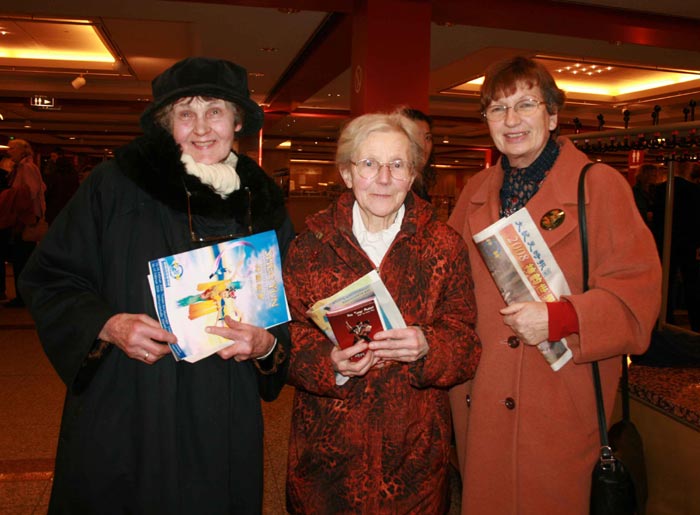 【明慧网二零零八年二月十八日】(明慧记者德祥、杨思源法兰克福报导)二月十七日神韵巡回艺术团在德国法兰克福的最后一场演出结束时,记者在门口遇到了三位老太太。 比特太太(左)、盖斯太太和永克太太(右),尽管另两老太太笑她,盖斯太太(中)坚信是“太祖”叫她来看晚会的。