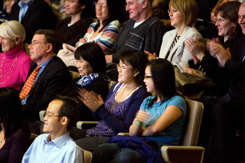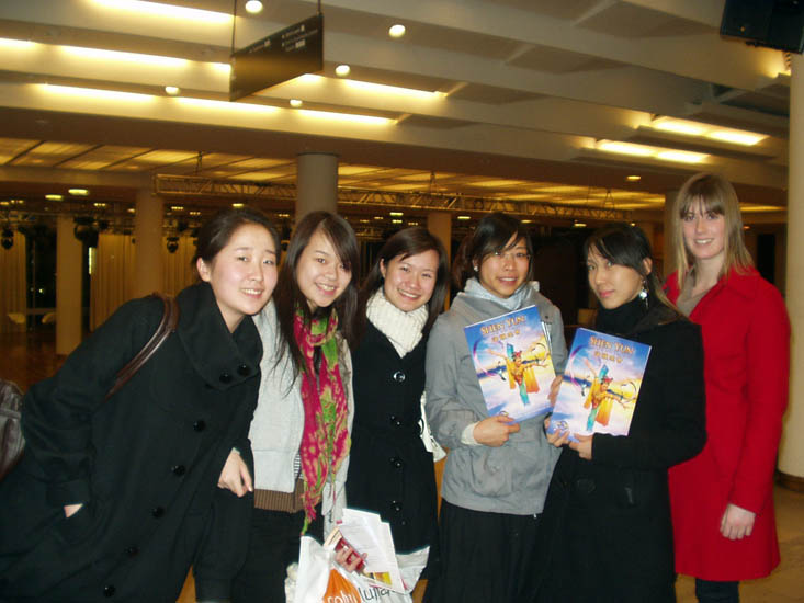 神韵是视觉和心灵的冲击 来自广西的杨小姐目前在伦敦国王学院(King's College)攻读生物医学,她和朋友们一起前来看神韵晚会。她说:“我对表演很喜欢,觉得很骄傲(proud)。用歌舞形式来表现,让大家知道法轮功是什么样的,很好。” 她说:“我觉得神韵是很好的交流方式,让外国人更了解我们中国的文化。”杨小姐形容这场晚会是“视觉和心灵的冲击”,她说明年还要和朋友一起来看神韵演出。   杨小姐和同在伦敦国王学院(King's College)读书的朋友们一起来看神韵晚会。他们都表示很喜欢这台演出。 |