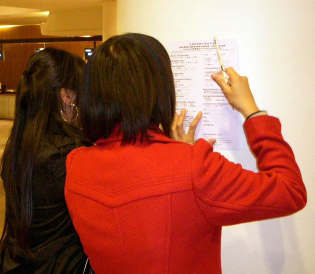 两个欣赏完神韵晚会的中国女孩在中文反馈表上给晚会打了满分 |