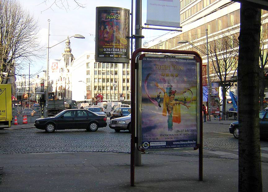 【明慧网二零零八年二月二十六日】(明慧记者李信、德祥比利时报导)神韵巡回艺术团将于二月二十六日来到比利时第二大城市安特卫普市(Antwerp)。早春的阳光下,在安特卫普市的街道上,“神韵晚会”海报随处可见,东方仙女的云裳份外耀眼,也增添了春天的气息。 神韵海报在安特卫普街道随处可见 |