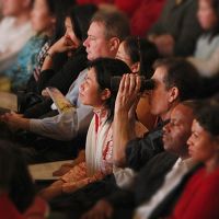 【明慧网二零零八年二月三日】(明慧记者周容纽约报导)住在纽约Staten Island的朱女士,从中国浙江来美国已七、八年了,平日非常注重小孩的华文教育。几天前在逛街时她得知「新唐人全球华人新年晚会」的讯息,马上买票带着七岁女儿一起来看二零零八年二月二日下午场的表演。 观众们聚精凝神观看二月二日下午在纽约无线电城音乐厅演出 |