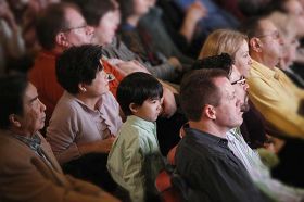 【明慧网二零零八年二月三日】(明慧记者心笛报道)从中国大陆来美国探亲的大学教授韩女士和女儿一起,带着一对双胞胎外孙女,一同前来纽约无线电城音乐厅观看神韵二月二日晚的演出。韩女士看完演出后含着眼泪对明慧记者说,这个晚会让她感到很亲切。 观众们聚精凝神观看二月二日在纽约无线电城音乐厅演出 |