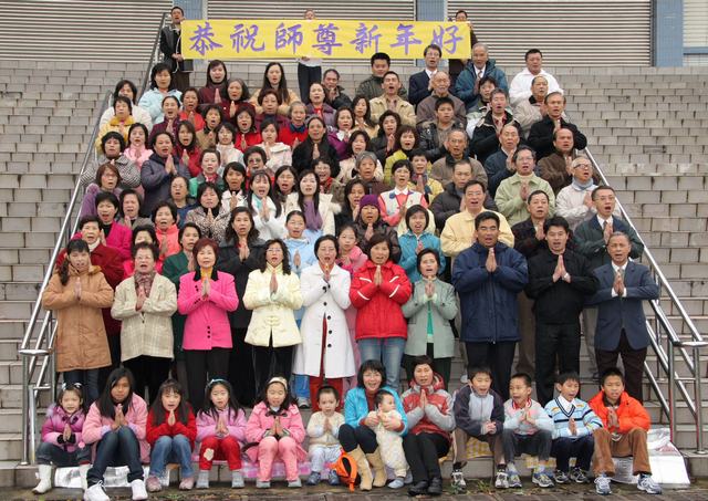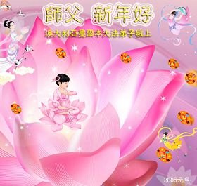 2008年1月1日上午9点半,屏东大法弟子在县立体育馆广场前,一起向师尊拜年,表达对师尊无限的感恩。 澳大利亚墨尔本大法弟子祝慈悲伟大的师尊新年快乐