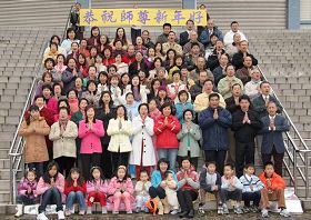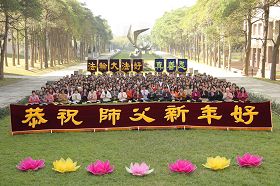 中兴湖是以中国大陆(包含蒙古)的地图为轮廓建造的湖形,法轮功学员以巨大的发正念图形在湖的旁边排构展现,除了互勉在新的一年发正念做好三件事外,更关注广大的在中国大陆以真善忍为修炼准则的法轮功学员受迫害情形,呼吁早日制止这场史无前例的迫害。 台湾北桃园学员集体学法并向师尊拜年(图)