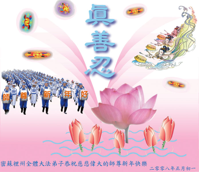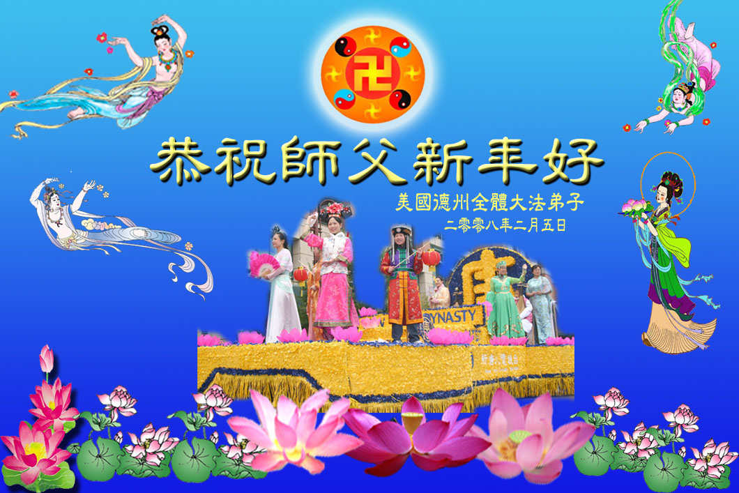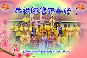 美国德克萨斯州达拉斯全体大法弟子给慈悲伟大的师尊拜年!恭祝师尊新年快乐! 美国德克萨斯州达拉斯全体大法弟子叩拜 二零零八年二月六日 大费城地区大法弟子问师父新年好!
