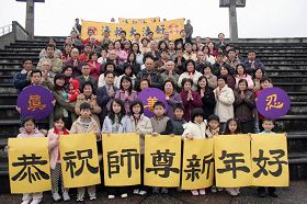 文/桃园大法弟子 二零零八年一月二十八日,台湾北桃园地区的法轮大法学员举办每月一次的集体学法交流,并于会后集体合影向伟大慈悲的师父拜年。  台湾北桃园大法弟子向师尊拜年 |