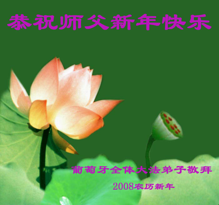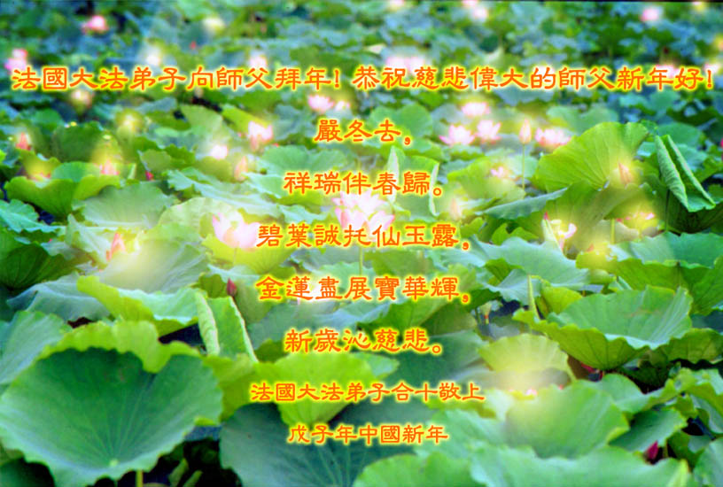 师父您好, 中国新年又到了,值此辞旧迎新的日子,法国大法弟子向师父拜年!恭祝慈悲伟大的师父新年好! 大法弟子还要继续努力的按照师父的要求救度众生,不辜负师父的希望,做好三件事;在不断的讲清真相中让人们看到真善忍大法的美好和这场迫害的邪恶,从而救度更多的世人和众生;把真相讲到位,让更多的生命能有美好的未来。 希望师父保重,不要过多的操劳。再次祝师父和师父的家人新年好! 忆江南•贺新年 严冬去, 祥瑞伴春归。 碧叶诚托仙玉露, 金莲尽展宝华辉, 新岁沁慈悲。 法国大法弟子合十敬上 戊子年中国新年 葡萄牙大法弟子恭祝师尊新年快乐
