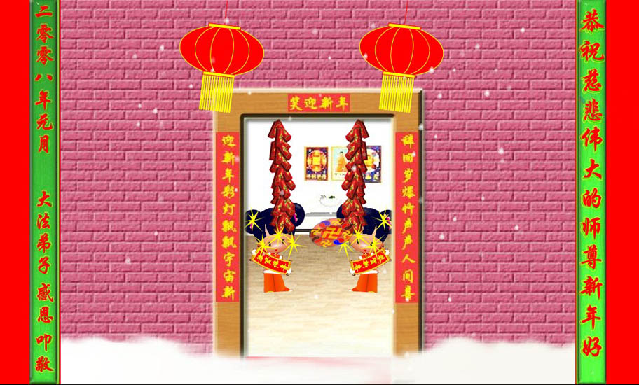 观看闪画:迎新年(1.4MB) 闪画:河北邯郸市大法弟子向师父拜年