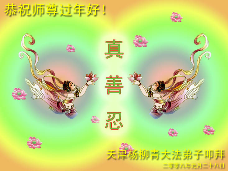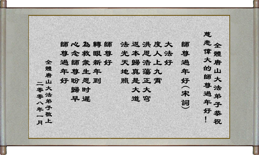 向伟大的师尊致以崇高的问候:师父新年好! 我一定会正视自己的不足,找到自身存在的问题,及时归正,更加努力的做好三件事,请师父放心!紧跟正法進程,稳健的走好、走稳、走正助师正法之路,让我们无愧于“正法时期大法弟子”这一称号。 合十 2008年2月1日 全体秦皇岛大法弟子恭贺师父传统佳节新年好