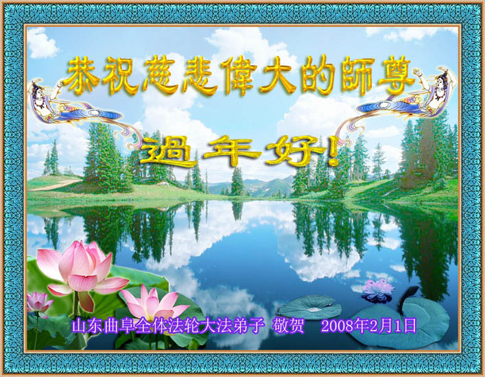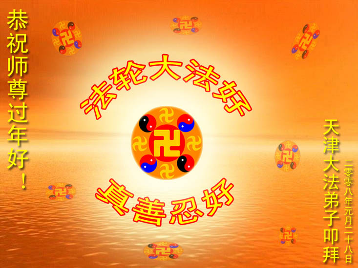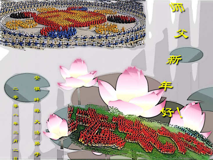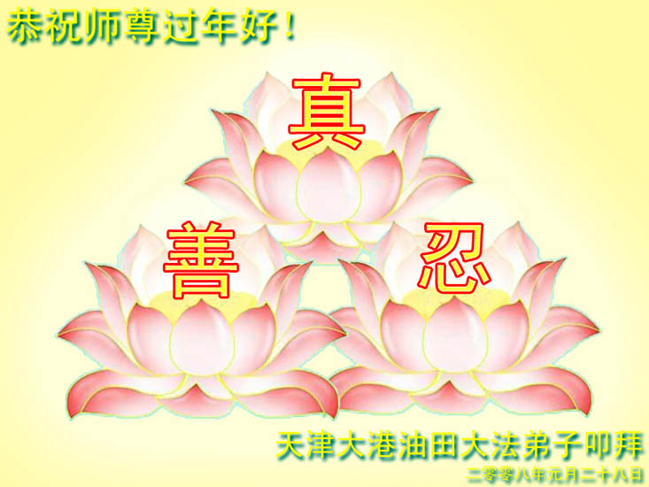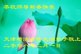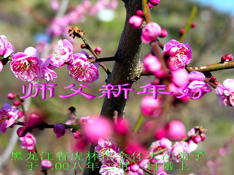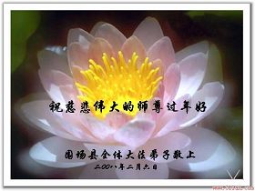 师父:您辛苦了,弟子们想念您,在家乡给您拜年。我们要在新的一年里更好的 做好三件事,迎接师尊早日回来。 顺义区大法弟子合十 二零零八年二月一日 全体塔河大法弟子恭祝师尊新年好!