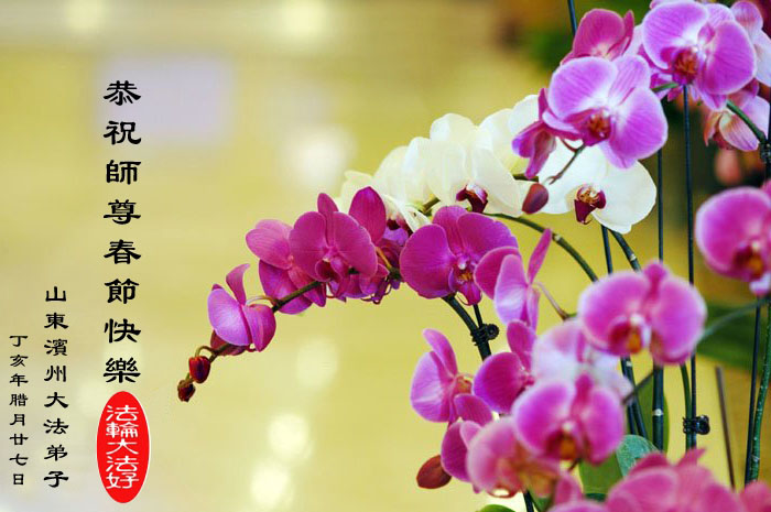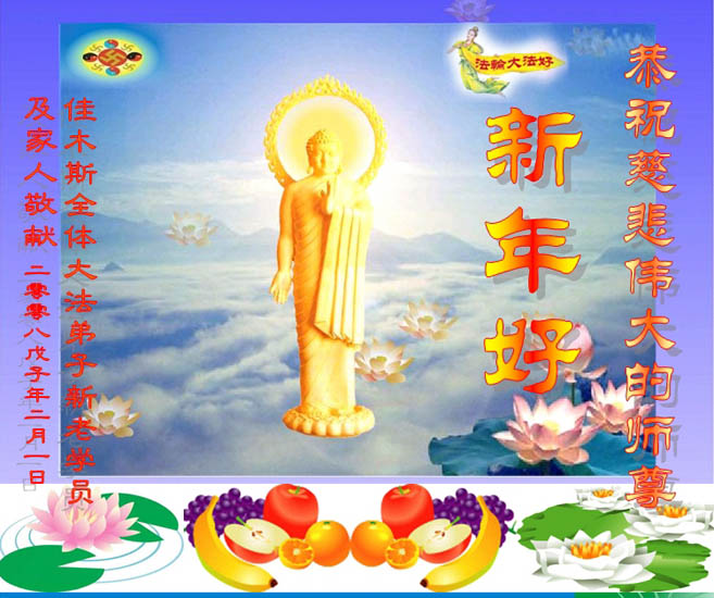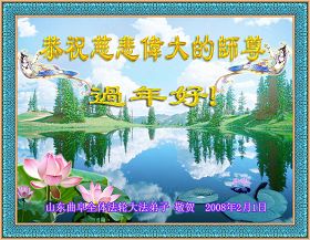 中国传统新年到来之际,黑龙江省佳木斯地区全体大法弟子、新老学员及家人怀着无限感激的心情恭祝慈悲伟大的师尊新年快乐!我们定不负师恩,做好师尊要求的三件事,救度一切可救度的众生,直到和师尊团聚的那一天,笑迎师尊,同归新宇! 千王下世助师尊, 得法救众感师恩; 历难九载天将明, 圆满飞升新宇神。 黑龙江省佳木斯地区全体大法弟子、新老学员及家人敬献 二零零八年二月一日 潍坊大法弟子向慈悲伟大的师尊问好!