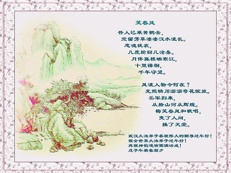 笑春风 昔人已乘黄鹤去, 空留芳草萋萋汉水流长。 忠魂犹在, 几度轮回几沧桑。 月伴孤楼映寒江, 十里徘徊, 千年守望。 风流人物今何在? 光照晴川沥沥奇花绽放。 岳军归来, 从拾山河从辉煌。 梅笑春风和歌唱, 变了人间, 换了天堂。 武汉大法弟子恭祝伟大的师尊过年好! 祝全世界大法弟子过年好! 再祝神韵巡演圆满功成! 戊子年新春前夕 河北武安大法弟子向师尊问好