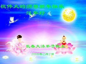 伟大慈悲的师父啊,弟子千遍万遍衷心祝愿师父新春快乐,时时欣慰!事事顺心! 弟子牵着您的衣襟,跌跌撞撞走过了十一个年头;您将弟子这满身污垢、心灵糜烂的罪人从地狱里捞起、洗净,教弟子明法理,告诉了弟子生命的真正意义,使弟子幸运的成了大法徒——正法时期的大法弟子。千言万语谢不尽啊——我们的恩师! 弟子知道:十一年啊,师父您拽着、扶着、推着、托着弟子一步一步走在神的路上,弟子每一点一滴的提高无不溶進您无量的心血;您为弟子们的承受与操劳几乎耗尽了您的一切! 弟子知道:弟子离师父的期望还差得很远,于大法的要求还有距离,那些顽固的人心(私心、争斗心、好胜心、欢喜心、显示心、爱听好话的心、虚荣心、求安逸心,但是都比较弱了)时不时的往出翻时,师父您那慈悲的点醒和精心的呵护常常令弟子泪流满面…… 请师父放心,今后弟子会加倍努力学好法,时时事事向内找,严格要求心性上提高,正念正行,修好自己,做好三件事,尽力救更多的世人,了却史前的大愿。 弟子天天思念恩重无边、伟大慈悲的师父,盼望师父,向往师父,愿师父早日回来与弟子们团聚! 南京一大法弟子跪拜 二零零八年二月一日 长春大法弟子给慈悲伟大的师父拜年!