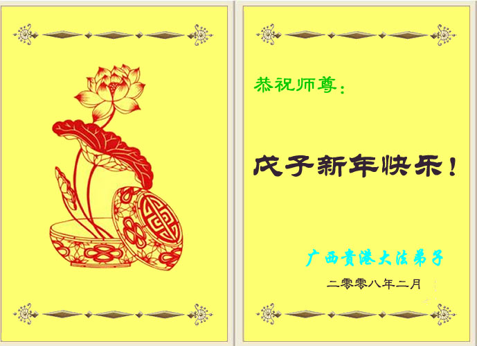 弟子一定做好三件事,不负师望,不负众托,修好自己救度众生,请师尊放心。 08.02.01。 广西博白县大法弟子恭祝伟大的师尊春节快乐!