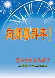 2008年开始了,我们一定要尽自己最大的努力抓紧救度世人,同时修好自己,让师父多一些欣慰。“师父您辛苦了,盼望与您早日相见”。 锦州大法弟子 上海宝山区的大法弟子向伟大师父拜年,恭祝师父新年快乐。