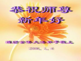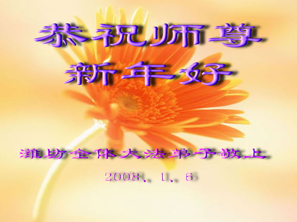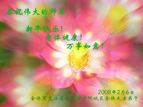 一年一度的传统节日新年已来临,特向师尊问好,新年伊始,我一定按着师尊的教导,做好三件事,决不辜负师尊的慈悲苦度,请师尊放心。 佳木斯市老年大法弟子 2008年1月29日 穆棱市全体大法弟子恭祝师尊新年快乐