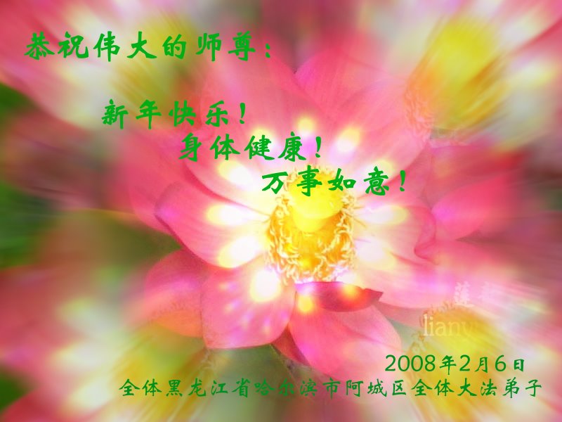 在新年即将到来之际,我们盘锦西三场全体大法弟子向慈悲伟大的师尊问好,敬祝师父新年好! 在新的一年里,我们更加努力做好师尊安排的三件事,勇猛精進修好自己,助师救度更多众生,决不辜负师尊的慈悲苦度。 我们道一声:师父您辛苦了! 盘锦西三场全体大法弟子合十敬上 2008年2月1日 佳木斯中部大法弟子祝师尊新年快乐!
