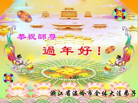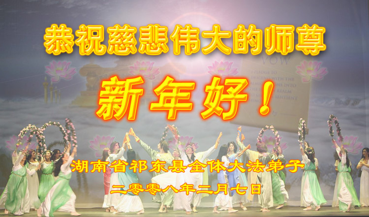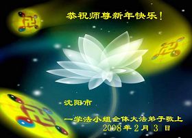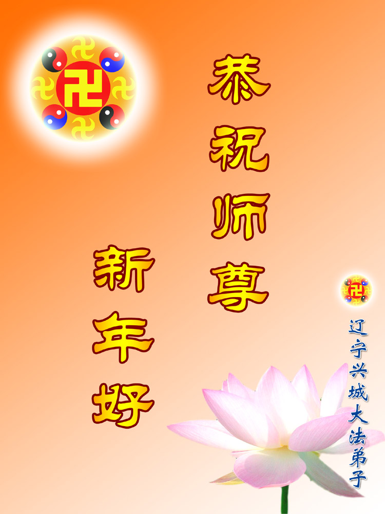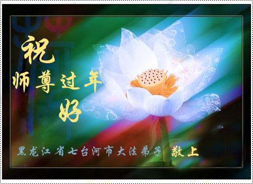 师尊:您好! 在2008年农历新年到来之际,弟子们向您致以最诚挚的节日问候!祝师尊新年愉快! 在新的一年里,我们一定会更加努力的做好三件事,完成历史赋予我们的伟大使命。做到“越最后越精進”,早日随师把家还。 北京市宣武区大法弟子2008年2月2日 辽宁葫芦岛绥中县西部农村大法弟子恭贺伟大慈悲的师尊新年快乐