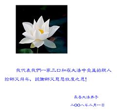我们要珍惜正法修炼的最后机缘,精進实修,做好三件事,救度更多众生。 身入红尘心在外, 净莲慈悲香风来。 师尊指引神路行, 万古天门从此开。 二零零八年二月二日 吉林市大法弟子恭祝慈悲伟大的师尊过年好