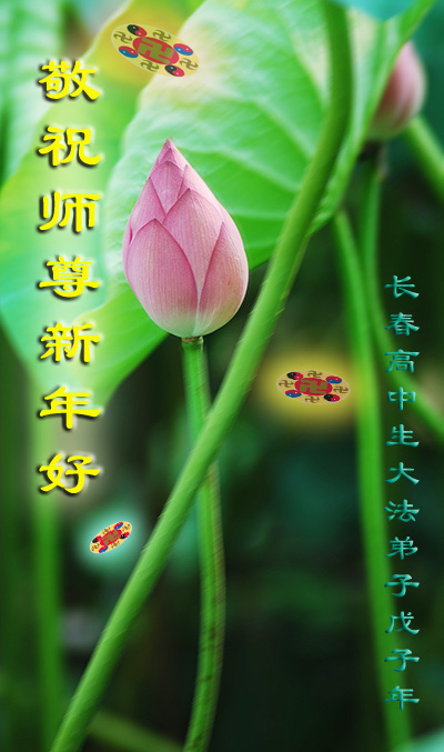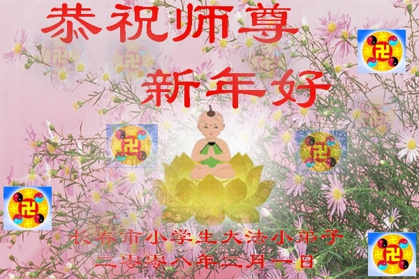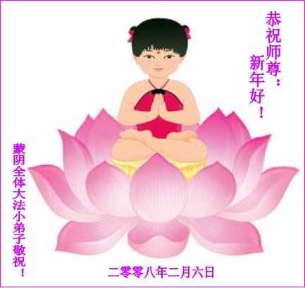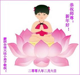 | 【明慧网二零零八年二月七日】 大连开发区小弟子祝师尊过年好! 小弟子恭祝师尊新年快乐! 长春市小学生大法弟子恭祝师尊新年好! 济南全体大法小弟子恭祝师尊华人新年快乐! 辉南县全体大法小弟子恭祝慈悲伟大的师尊新年快乐! 四川绵阳全体大法小弟子恭祝师尊新年快乐! 湖南湘潭学生大法小弟子向慈悲伟大的师父问候新年:师父新年快乐 山东省蒙阴县全体大法小弟子恭祝慈悲伟大的师尊新年好! 长春高中生大法弟子敬祝师父新年好! 河南省周口市大法小弟子恭祝师尊新年快乐 澳洲小弟子恭贺伟大的师尊新年快乐! 八岁小弟子祝师尊过年好 大连开发区小弟子祝师尊过年好!
