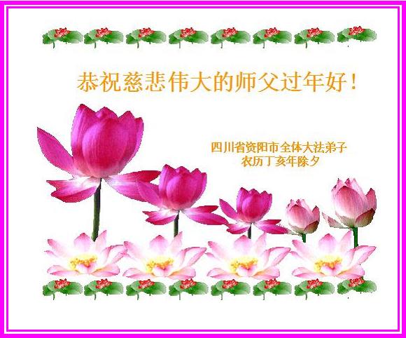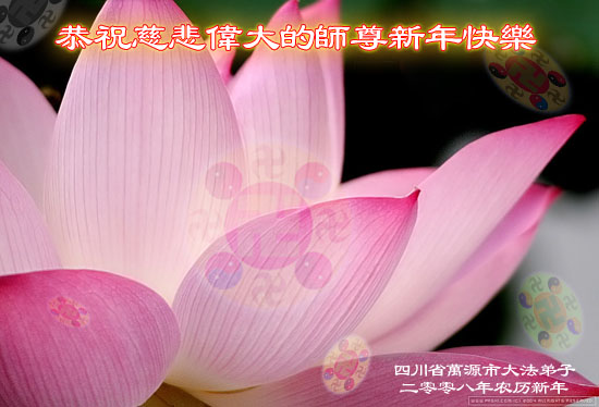师尊好!师尊辛苦了!师尊新春快乐! 在新的一年中,我们将加倍努力,做好“三件事”,紧跟正法進程。 二零零八年二月二日 四川省阆中市全体大法弟子恭祝慈悲伟大的师尊新年快乐!