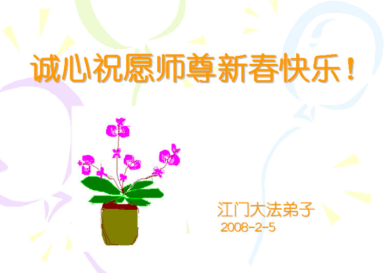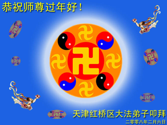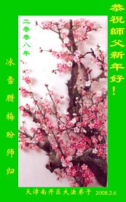 在新的一年里,我们将更加努力做好师尊要我们做的事情,学法精進走好修炼的路。 黑龙江省龙江县大法弟子。 2008年2月2日 黑龙江双城农村大法弟子祝慈悲伟大的师尊新年快乐。