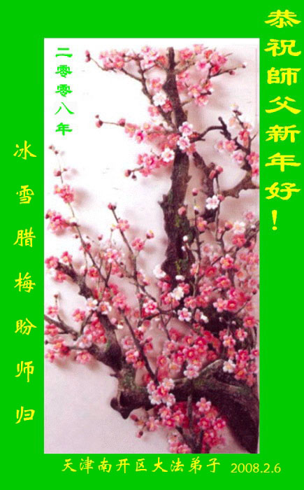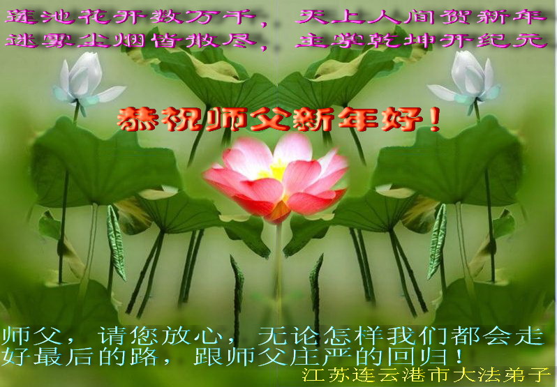 师尊新年好!弟子们向伟大的师尊致以最崇高的敬意!师尊您辛苦了! 请师尊放心,弟子们在今后的证实法中一定救度好世人,做好三件事。做任何事情的出发点以救众生为第一念,以仙姿百态,百花笑盈盈的心情共同迎接普天同庆的到来。 弟子们再一次拜贺师尊新年好! 心愿 身在方寸间 志念随心愿 满载众生归 圆满随师还 黑龙江省哈尔滨市长林子劳教所非法关押的二十七位法轮大法弟子 二零零八年二月一日 公主岭大法弟子恭祝师父新年快乐