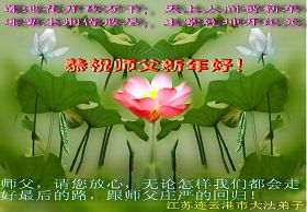 恭祝师尊戊子年快乐!我们一定按照师尊的要求,做好三件事,走好正法修炼的最后这段路,发挥最大的能力,救度更多的众生,完成助师正法的史前大愿,不负正法时期大法弟子的神圣使命! 顺祝明慧同修和所有海内外同修们新年快乐! 高密大法弟子祝师尊新年好!
