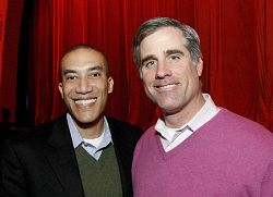 | 【明慧网二零零八年二月七日】(明慧记者黄凯莉纽约报导)中场休息时,钟坤与同事Patrick Hylton和Dan Taylor有说有笑。钟坤介绍说:“晚会令人印象深刻(impressive),同事们看了都很兴奋。”钟坤一行三人都是新泽西州BMS制药公司的职员。二月六日新年除夕,他们一起前来观看纽约无线电城音乐厅下午场的新唐人华人新年晚会。钟坤说,从中国广西移民来美十几年没有看过这样的晚会,以前在中国大陆也没有看过这样的晚会,“歌、舞、故事,都挺好。”  Patrick Hylton和Dan Taylor说:“唐鼓舞很令人振奋。”
