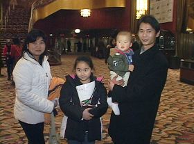 【明慧网二零零八年二月九日】(明慧记者采菊纽约报道)二零零八年二月七日,中国新年的大年初一,纽约街头春风阵阵。傍晚时分,无线电城早早的排起了长龙。许多华人携家带口,有些是祖孙三代,选择在无线电城的音乐厅看新唐人华人新年晚会来庆祝一年的开始。大幕拉起时,大幕落下时,热烈的掌声夹带着惊叹声表达着观众的喜爱和兴奋。 林先生一家来观看新唐人华人新年晚会,庆祝佳节 |