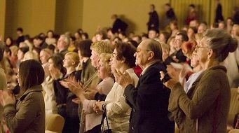 【明慧网二零零八年三月十四日】(明慧记者吴思静、李信,捷克报导)神韵巡回艺术团于三月十一日在布拉格国际会议中心大厅(Prague Congress Centre)进行第二场演出,演出结束时,观众长时间鼓掌,大幕因此两度拉开,演员两次向热情的观众谢幕,大幕再次合上时,大部份观众都仍旧站在原地热烈的鼓掌,望着舞台依依不舍,没有离开的意思,当大幕第三次拉开,身着绚丽多姿演出服的演员们再次出现在观众面前时,观众席上传出了欢呼声和更热烈的掌声。 神韵晚会在布拉格国际会议中心大厅的第二场晚会结束时,全场起来鼓掌,演员三度谢幕。有的观众感叹道:这种场面在布拉格很少见。 |