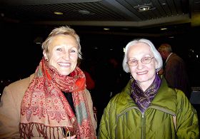 画家佛里兹•廓利耶(Fritz Collie)与夫人一起观看了晚会,他们表示,出于画家的敏感则特别注意到舞台的天幕设计,他说:“舞台上的天幕设计很漂亮,非常棒。色彩特别漂亮,非常好看。” 他还加重语气说:“还有服装,特别漂亮,再也没有比这更好的表现方式了!”廓利耶夫人吉泽拉(Gisela Collie)补充说:“根本就无法形容那是多么的漂亮。” 吉泽拉还说:“(节目)非常好。特别是舞蹈,色彩,非常让人着迷,我的眼睛都看不过来了,非常漂亮。比如藏族的舞蹈(《雪山白莲》),表达的很好。但是对于眼睛,对于灵魂来说,我觉得水的那个节目(《仙女踏波》)非常出色!我非常喜欢!” “我真正被打动了,太美了。”   神韵晚会观众:退休教师巴巴拉(左)和多拉(右) |