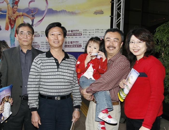 | 【明慧网二零零八年三月十六日】(明慧记者刘文新台湾台北报导)二零零八年三月十五日神韵艺术巡回团移师至台湾首都台北,扫除几天阴霾的天气,台北露出难得的阳光,首场演出座无虚席,每一个节目帷幕拉起时,掌声如雷不断响起,台湾各界精英云集了台北国际会议中心,观赏纽约神韵巡回艺术团首演的演出。 我的心灵被牵动着 一场难得心灵上的飨宴 中鼎工程股份有限公司业务主任黄振昌和好友华科彩邑公司陶总经理携眷一同观赏神韵,黄振昌在观赏演出后表情平静祥和说:“我觉的每一个戏目,可以挑动一些心灵上的感动,神韵的节目中看到了各朝代、各民族追求这种真,追求这种美,这种善的境界,我的心灵被牵动着,包括演出中的音乐、节目的架构,那种心情上的平静,没有了世俗间的纷纷扰扰,尔虞我诈。”  中鼎工程股份有限公司业务主任黄振昌和好友华科彩邑公司陶总经理携眷一同观赏神韵,黄主任表示:我的心灵被牵动着,一场难得心灵上的飨宴(左二)。 |