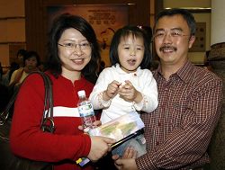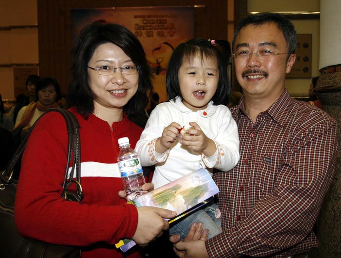 黄振昌还说:“我以前所看到中国人演出的节目内容,鲜少有这种中国传统的文化,观赏神韵后节目中看到了中国传统文化的呈现及心灵上的飨宴,是比较难得的经验,我和朋友经常到大陆,看一些表演、秀之类的节目,那些只是一些风景及一些舞蹈。但今天看到神韵艺术巡回团的演出,内心深深觉的演出的每一个演员都是用心在跳,所表达出来那种真善美。” 节目安排很有意思 舞台效果很棒  华科彩邑公司陶总经理表示:觉的节目很丰富,仙女下凡的场景很美,舞台效果很棒(手抱着女儿的陶总经理和夫人一起合影)。 |