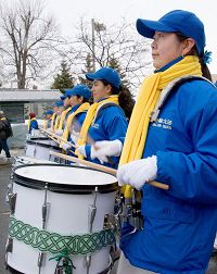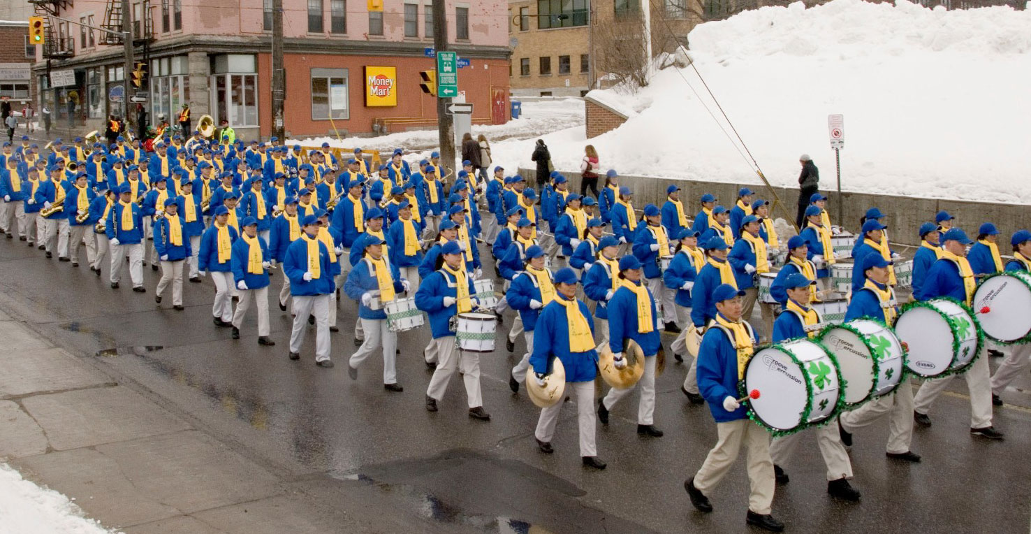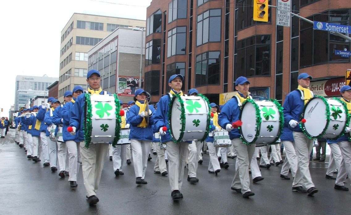 | 【明慧网二零零八年三月十六日】(明慧记者英梓渥太华报道)为庆祝传统节日“圣•派翠克日”(St. Patrick’s Day),二零零八年三月十五日,爱尔兰社区在加拿大首都渥太华举办了大型游行庆典。由多伦多、蒙特利尔和渥太华三地一百一十名队员组成的“天国乐团”出现在游行队伍中。图:渥太华“圣派翠克日”大游行中的天国乐团 游行队伍从渥太华市政府出发,途经劳瑞尔西路(Laurier Avenue West)和班克街(Bank Street),最后抵达岚思东公园(Lansdowne Park)。雄浑的乐曲、整齐的服装和队列、漂亮的动作吸引了大量市民观赏。沿途许多市民看到游行队伍后欢呼、雀跃,伴着乐曲声鼓掌。 这次游行的协调人爱德华•柏利先生(Edwards Barry)对天国乐团赞赏有加,认为“整个乐团真是太棒了!”柏利先生说:这次参加渥太华游行的一共有六个乐团,其他参加游行的乐团还有渥太华消防部乐团(Ottawa Fire Department Band),枫叶黄铜乐团(Maple Leaf Brass Band)等,但是最著名的是上着蓝装,下着白裤的天国乐团。 加国家税务部长格顿•格纳(Gordon O’Conor)、渥太华市长拉里•欧布里安(Larry O’Brien)和市议员库伦(Alex Cullen)、爱尔兰大使戴维•基亭(David Keating)等都参加了这次游行。加拿大电视台(CTV),A Channel电视台和渥太华公民报对当天的游行作了现场报道。 天国乐团在游行期间演奏使用包括打击乐器、木管和铜管三大类十五种乐器,演奏了三首乐曲。江帆先生在接受记者采访时说,“今天是天国乐团在渥太华的首次游行。天国乐团的成员都是法轮大法修炼者。乐团在社区活动中的出现,让主流社会有更多机会看到法轮功,了解法轮功的真相。同时,也丰富了加拿大的多元文化。” 天国乐团团长江帆先生介绍,加拿大多伦多天国乐团成立于二零零六年四月,目前在多伦多有一百八十名队员,之后,在蒙特利尔和渥太华也有近百名队员加入。天国乐团成立时间虽然不长,但由于队员的努力,技术水平提高很快。天国乐团在安省已经参加了三十六次游行。去年国庆节还在蒙特利尔获得了最高奖——总统奖。 十六日,加拿大天国乐团还将在蒙特列尔、多伦多和温哥华等地参加“圣•派翠克日”大型游行活动。