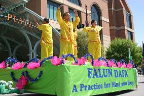【明慧网二零零八年三月十六日】(明慧记者舒静休士顿报导)美国休士顿是一个多元化城市,市民们乐于庆祝各种节日。圣帕特里克日(St. Patrick's Day)源于爱尔兰的传统文化,随着移民及时代的变迁,已发生了变化。休士顿举办的圣帕特里克日大游行,也吸引了其他族裔团体、公司的人士参与,呈现多种文化,使其成为各族文化交流方式之一。今年,法轮功学员首次参加休士顿圣帕特里克日游行,展示中国传统文化,受到民众欢迎。 穿着黄色炼功服的法轮功学员向沿路观众展示法轮功五套缓慢、优美的功法 |