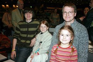 | 【明慧网二零零八年三月十七日】(明慧记者德祥、李信德国柏林报导)神韵晚会三月十五日下午场结束时,不少观众长时间站立鼓掌,演员三次谢幕。演出时,台上台下互动频频,精彩的节目不时引来观众的叫好声和掌声;《万王下世》、《仙女踏波》、《迎春花开》等许多节目的大幕一拉开,观众席上便掌声一片;特别是当看到表现中国民众的觉醒,制止恶警迫害修炼“真、善、忍”的母女俩时,观众席中更是爆发出如雷般的掌声…… 瓷器设计师一家:演出给人留下深刻的印象   克劳瑟先生、七岁聂拉、八岁艾玛和她们的哥哥 |