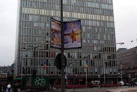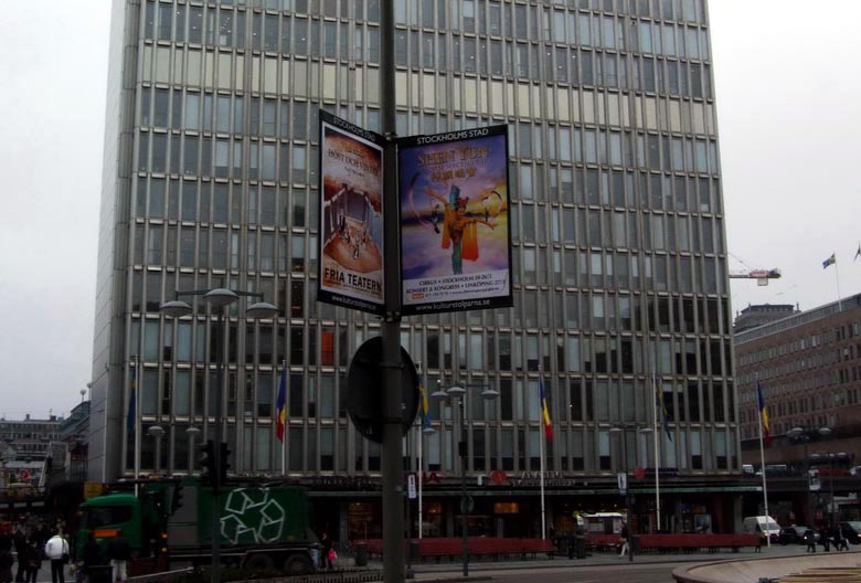 瑞典首都斯德哥尔摩是北欧第二大城市,位于辽阔的波罗的海西岸,梅拉伦湖入海处,森林覆盖面广阔,山清水秀,是一座典雅的文化名城,它由十四个岛屿组成,有七十余座大小桥梁相连,古色古香别具一格,故素有“北方威尼斯”之称,是著名的旅游胜地。 如今,中国古老的传统文化越来越被西方人所青睐,神韵巡回艺术团以其庞大的阵容、高超的艺术水准、令人惊叹的天幕制作、对中国传统文化的纯正演绎,在北美、欧洲、亚洲各地均引起轰动,早已引起瑞典各界人士的关注。 正当瑞典民众获悉神韵艺术团首次来瑞典演出的喜讯时,两个月前,中共使馆却以两国关系将会受到影响为威胁,打电话恐吓林雪平市文化部主席约翰•林格伦(Johan Lundgren),要求他阻止神韵艺术团的演出,还打电话给瑞典首都主管文体的副市长玛达琳•舍斯黛特(Madeleine Sjostedt),也威胁她取消神韵在斯德哥尔摩市的演出。这些的无理要求均遭到堂堂正正的回绝。 瑞典人民一向尊重民主和言论自由。此事曝光后,瑞典政界、媒体和民众纷纷对中共使馆挑战瑞典民主人权的行为进行谴责,同时人们对神韵巡回艺术团的行程更为关注,对这台不寻常的神韵晚会增添了许多的好奇和向往。有很多人都是在一个多月前就定好了最好位置的神韵巡回艺术团在瑞典的演出更让人们翘首以待。  在斯德哥尔摩市中心处处可见“神韵晚会”宣传广告牌。 |