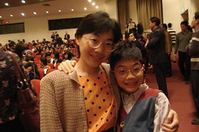 “我觉的我们里面的表演者全部都是面带笑容,我觉的很亲切;这跟以前所在看的表演都不一样。”台南县工商经营研究社社长郭美琴说,演出的服装很鲜艳,演员的动作很一致;看到后面打鼓的节目,感到振奋人心。 她还说,舞台效果很逼真,尤其是电脑动画,非常生动,相当棒。 东南地政事务所主任陈再福:满震撼的  东南地政事务所主任陈再福和孙女 |