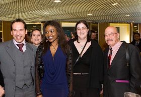 日内瓦州副州长兼财政部长戴维•伊莱(David Hiller)在看完演出后谈到:“这是个很美丽的演出,让人心情平静放松,音乐很优美,中西方结合的音乐,这一点很令人吃惊,但听起来,是那么动听。舞蹈很完美,动作是那么优雅,真令人一饱眼福。” 曾为历史老师的他谈到自己在看了演出后发现了一个有意思的现象:“这次表演的节目都有一个共同点。无论是舞蹈还是歌曲都有中国传统的内涵,同时也包括了其他民族的特点,所以体现了一种传统的美。”他认为这些民族的共同特征就是:“那就是‘真、善、忍’。” 他很喜欢《大唐鼓吏》和《威风战鼓》两个打鼓的舞蹈,和《顶碗舞》。他惊叹道:“那些舞姿太优美了,最令人吃惊的是,他们能如此好的掌握身体的舞姿和动作,而且他们的配合是那么的天衣无缝。当然这些都一向是中国人引以自豪的美德。” 金融界人士:看了晚会让我了解了中国传统文化 一位瑞士金融界的女士在中场的时候告诉记者,她喜欢上半场的舞蹈《仙女踏波》和《大唐鼓吏》,喜欢晚会鲜艳的色彩,动听的中国音乐。她说看了晚会后:“让我知道中国传统文化。” 看完整场演出后,她告诉记者的第一句话就是:“这(台节目)需要时间去理解。”她谈到:“在中国发生的事情让我触动很深。”除了打鼓的节目,她还喜欢《草原牧歌》。她说,节目和歌曲的歌词都非常打动人心。 电视台配型主任:舞蹈设计非常有艺术性,富有想象力 Alan Cluer先生是电视台的配型主任,他对舞台的天幕赞不绝口。 “设计非常好,与节目配合得非常好,不可思议(Fabulous)的设计。”他还谈到:“舞蹈设计非常富有艺术性,富有想象力。” 看了演出后,他表示:“中国的传统文化非常有意思。我夫人来自乌克兰,她和我有同样的想法。” Cluer夫人高兴的说:“(看着演出)就象去中国旅游一样,迷你的中国游。这是我第一次看到中国传统舞,非常漂亮。” 演出非常专业 还有两位不愿透露姓名的女士表示,演出非常有专业水准,她们喜欢所有的节目,特别是杨健生女士的演唱。当问到演唱是中文的,是否能理解时,她们高兴的说,从天幕的字幕中可以清楚的看到法语翻译,完全没有问题理解词义。她们认为是在天幕上打字幕是一个非常好的主意,也帮助人们了解节目的内容。 她们都表示要把节目推荐给自己的朋友。一位女士询问明年日内瓦是否也有晚会时,另一位女士马上说,不是明年,是明天,明晚就有一场。看来一年的等待时间对她们而言显然是太长了。  神韵在日内瓦的首场演出在瑞士雷蒙剧院演出 |