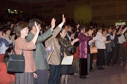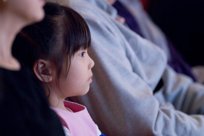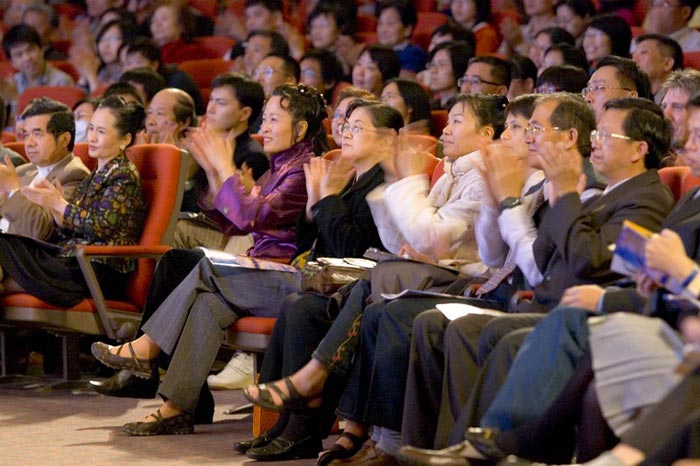 三月七日晚,神韵纽约艺术团在台湾巡回的第二站高雄县劳工育乐中心演艺厅,展开了第四场演出,落幕时观众起身鼓掌与致敬