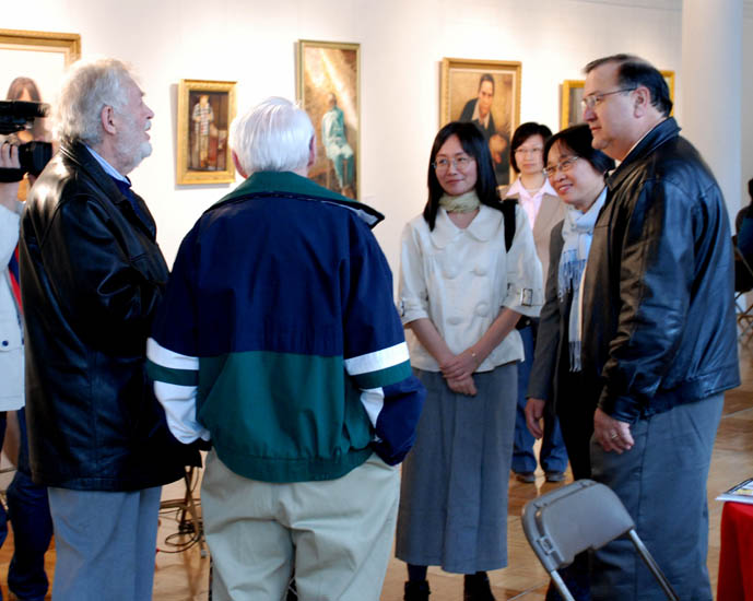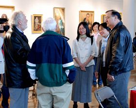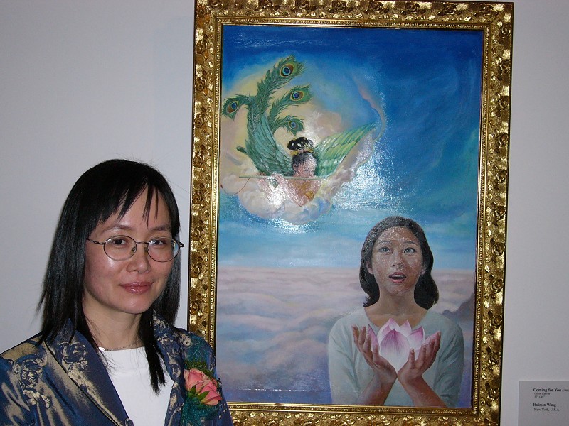 画展吸引了大量艺术家和民众观赏。伊斯顿市长萨尔•潘多先生(Salvatore J. Panto,Jr.)出席了四月六日的闭幕仪式,他表示欢迎这批画作的艺术家今后能再把作品带到伊斯顿。 历时近一个月的画展,参观者们被画作深深的打动。人们在画作前面慢慢走过,在每一幅前面都呆上很久的时间,被画面上人物的表情深深的打动。邻居小城菲利普斯堡的画家包伯.雷德蒙(Bob Redmond)说,“太好了,非常感人。人物的眼睛简直难以置信。”他说的是名为“儿子”的画作,作品中一个老人抱着他因修炼法轮功而被中共迫害致死的儿子的尸体。 本地一个雕塑创作室的主人卡尔斯特纳(Karl Stirner)说,“这些画作绝对的不可思议。”他说这些作品的质量堪与古代大师的作品相比较,但这些作品主题所展现的是“难以置信、令人惊叹”的。 据本地艺术家、展览的解说员魏简彻(Wei Jane Chir)说,这些绘画作品的风格属于“新文艺复兴时代”,这些艺术家使用了西方古典艺术大师传统油画的技巧。 依斯顿艺术理事会(Arts Council of Easton)总裁安东尼.马拉齐尼(Anthony Marraccini)先生出席了画展开幕仪式,并为三月八日的画展开幕仪式剪彩。 伊斯顿市长市长萨尔•潘多先生是艺术的爱好者,刚任职伊斯顿市长几个月。把伊斯顿城打造成一个艺术城是潘多先生上任以来的重要目标之一,在四月六日的闭幕仪式上,他表示很高兴这批画作能来到伊斯顿展出。 潘多先生说:“这些艺术家极富天分,他们传达了很强烈的信息,让你为那些不能按照自己的意愿自由的生活的人们感到悲伤。我认为他们做得非常好,我希望他们能再来到我们这个城市。”他还表示:画作“孤儿的悲伤”对他的触动最大。他说:“做一个孤儿太难了,要独立度过没有父母的生活。这是我从她(画作“孤儿的悲伤”中小女孩)的眼睛里看到的。”画作“孤儿的悲伤”表现了一个因为父母修炼法轮功被中共迫害致死而成为孤儿的小女孩。 伊斯顿艺术家联盟成员菲利斯•琼森表示,当地的艺术家们对画作评价很高,她还讲述了她的三位外孙女观赏画展的故事。菲利斯。琼森说:“她们说她们站在画前,泪就在脸上流下来,她们被这些画如此打动。让这些年轻人如我的三位十七岁、十八岁和二十四岁的孙女们来看这些画,领略画作背后的涵义,这很重要。”  在中国期间曾被数次监禁的艺术家王惠敏和她作品“为你而来” |