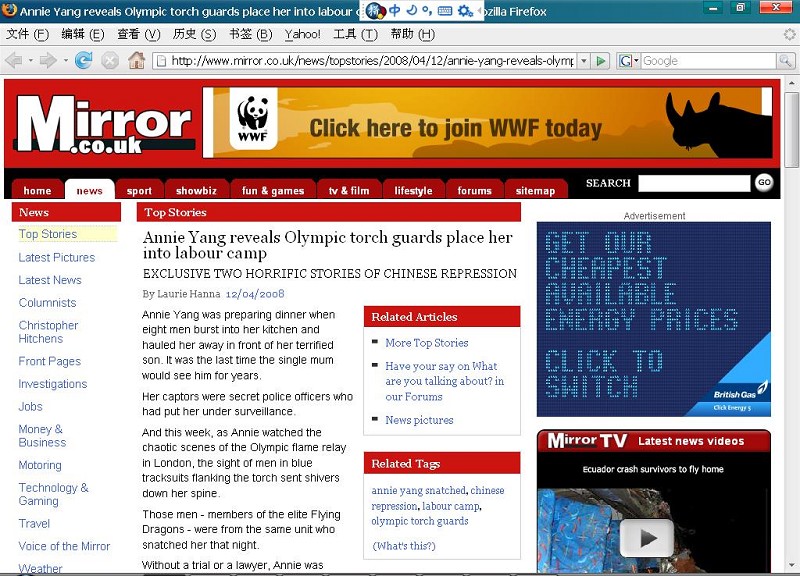 【明慧网二零零八年四月十五日】英国《每日镜报》四月十二日在首页刊登记者Laurie Hanna关于中共迫害法轮功的独家报导。文章列举了中共迫害法轮功的两个恐怖案例,讲述了中共不希望外界了解的故事。其中的一名法轮功学员被非法劳教两年,而参与对她逮捕的秘密警察,与近日被西方媒体广泛谴责的“奥运火炬护卫队”同属一个部门。 英国《每日镜报》四月十二日首页 |